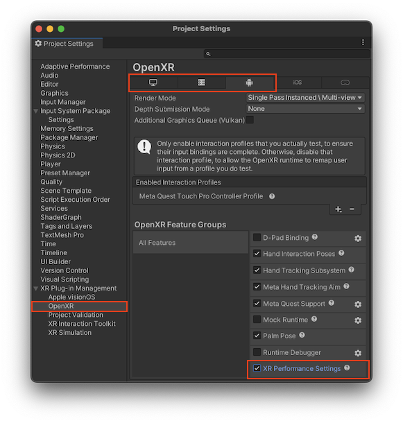To use the performance settings API, you must enable it in the OpenXR Project Settings: